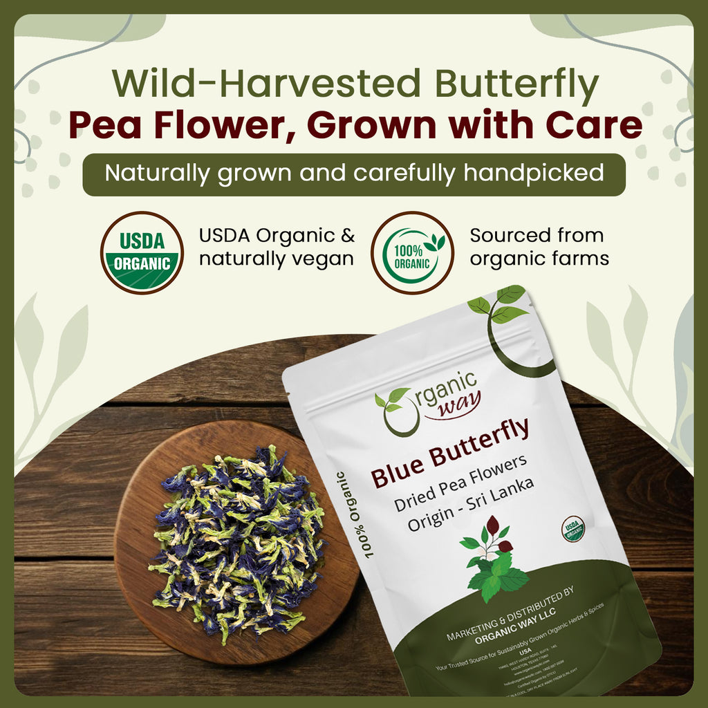Dried Butterfly Pea Flowers Tea Has Been Used For Centuries in Asia For Its Calming & Soothing Effects. USDA Organic Butterfly Pea Herbily Tea Loose Herbal Tea With Nutritious Benefits. ALL NATURAL PREMIUM QUALITY: Organic Way butterfly pea flowers 100% pure high-quality butterfly pea flowers, no chemical additions, non-GMO, non-toxic, gluten-free and caffeine-free. Herbal Infusion in Hot Water: Put 5 to 6 butterfly pea flowers into 8 ounces (about 240 ml) of boiling water at 208°F / 97°C and soak for 3-5 minutes. Add honey or lemon to create a sweet or sour flavor & watch the colors change from blue to purple. We find the right tea to suit your taste and enhance your overall well-being!Nature's Best Ingredients: We use all-natural ingredients straight from nature. Be assured, we source the best that nature offers for every blend, providing pure, authentic tea. Trust us for a tea experience that harmonizes with your well-being. Use For Skin & Hair : Organic dried butterfly pea flowers to make DIY face masks and extracts to improve skin and promote hair growth.