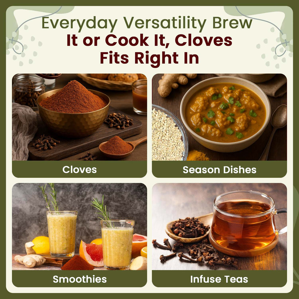 Cloves come from a small evergreen tree with smooth grey bark and large, bright green, aromatic and lance-head shaped leaves. Its flower buds are dried to produce this popular spice. The tree is native to India and Indonesia but is also found in Sri Lanka, Pakistan, Zanzibar and Madagascar. Cloves have a strong aroma and a spicy pungent flavour. Clove Powder is widely used in Asian, African and Middle Eastern cuisines. It can also be used in desserts that utilize cinnamon, nutmeg and other spice, or in sweet dishes with apples and pears.