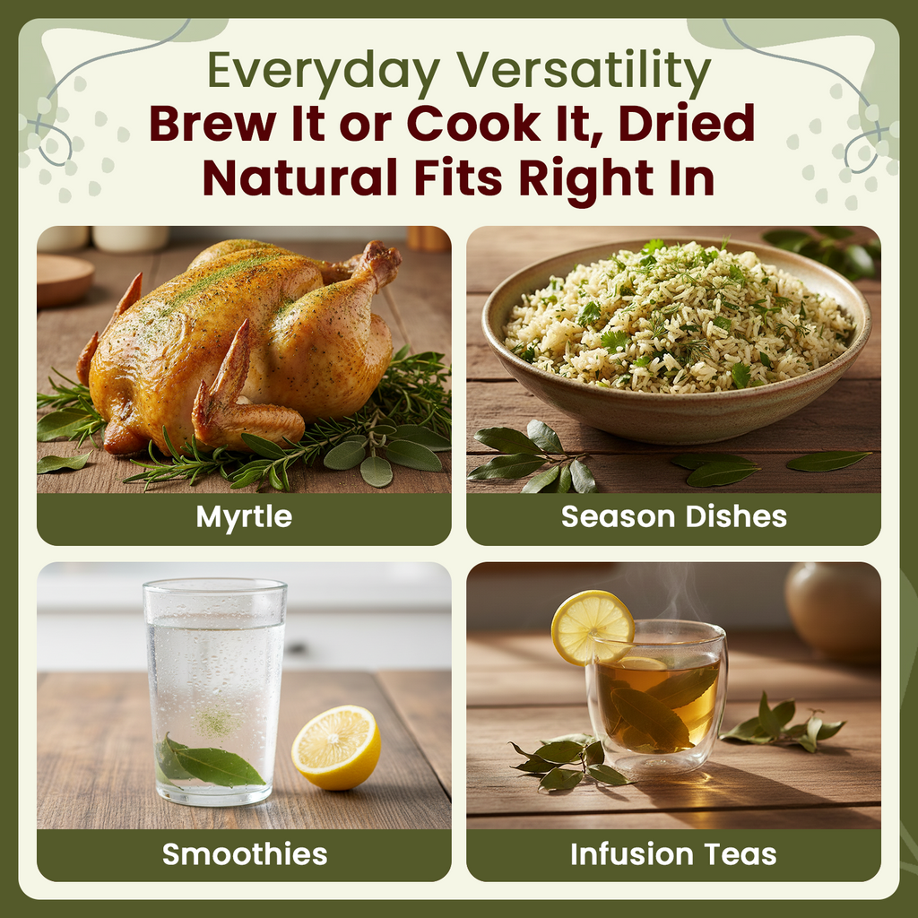 Awaken your wellness ritual with Myrtle Leaf Powder, a premium, finely milled botanical harvested under strict quality standards. Revered for centuries in Mediterranean herbal traditions, this potent green powder is loaded with antioxidant flavonoids, tannins, and essential oils that support radiant skin, digestive balance, respiratory health, and immune resilience. Myrtle Powder with its natural antimicrobial and anti-inflammatory herbs helps soothe blemishes, calm irritation, and promote a healthier complexion. When brewed as a myrtle tea powder or infused into smoothies, it aids digestion, supports gut flora, and gently detoxifies. As a topical mask, it revitalizes tired skin and restores natural glow. Free from fillers, additives, and artificial preservatives, our natural myrtle leaf is 100% pure and third-party lab tested for purity. Suitable for daily use, this versatile myrtus communis powder is your natural ally for skin brightening herbs, holistic beauty, and overall wellness.